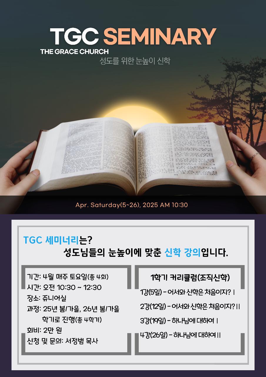 4월 매주 토요일에 진행되는 TGC 세미너리에 성도님들의 많은 참여 바랍니다.