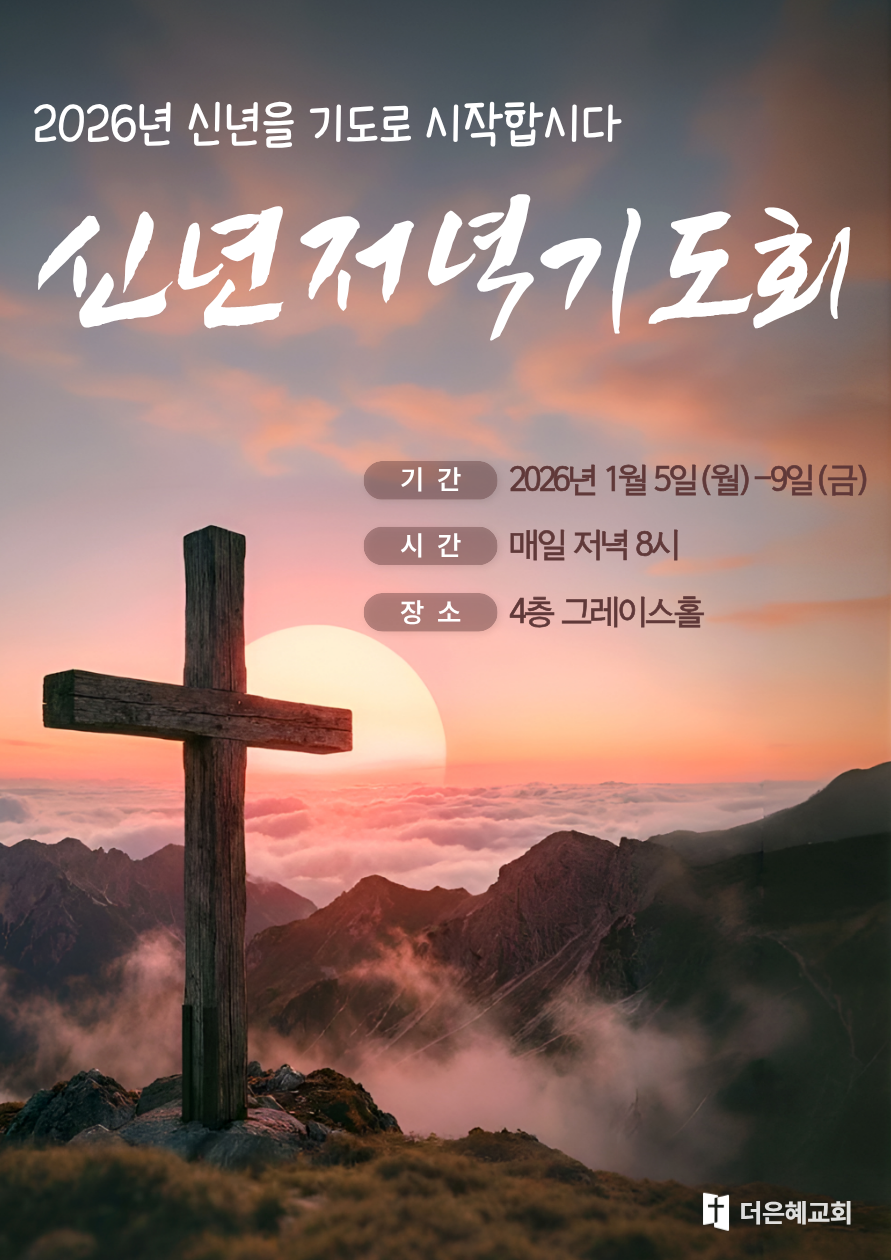 신년저녁기도회는 2026년 1월 5일(월)부터 9일(금)까지 저녁 8시, 4층 그레이스홀에서 진행됩니다.