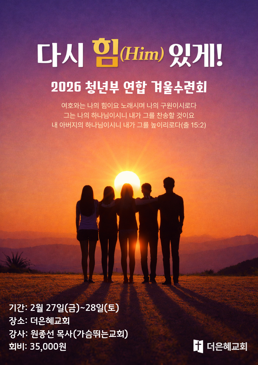 청년 1, 2부 연합 겨울수련회 2월 27(금)일부터 28일(토)까지 1박 2일의 일정으로 교회에서 진행됩니다.