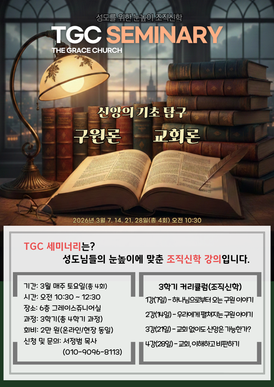 3월 매주 토요일(오전 10:30-12:30)에 진행되는 TGC 세미너리에 성도님들의 많은 참여 바랍니다.