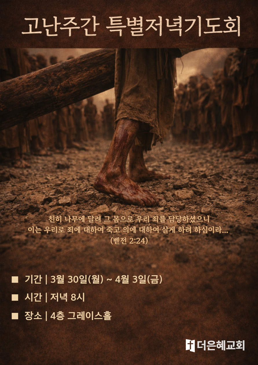 3월 30일(월)부터 4월 3일(금)까지 고난주간 특별저녁기도회를 진행합니다.